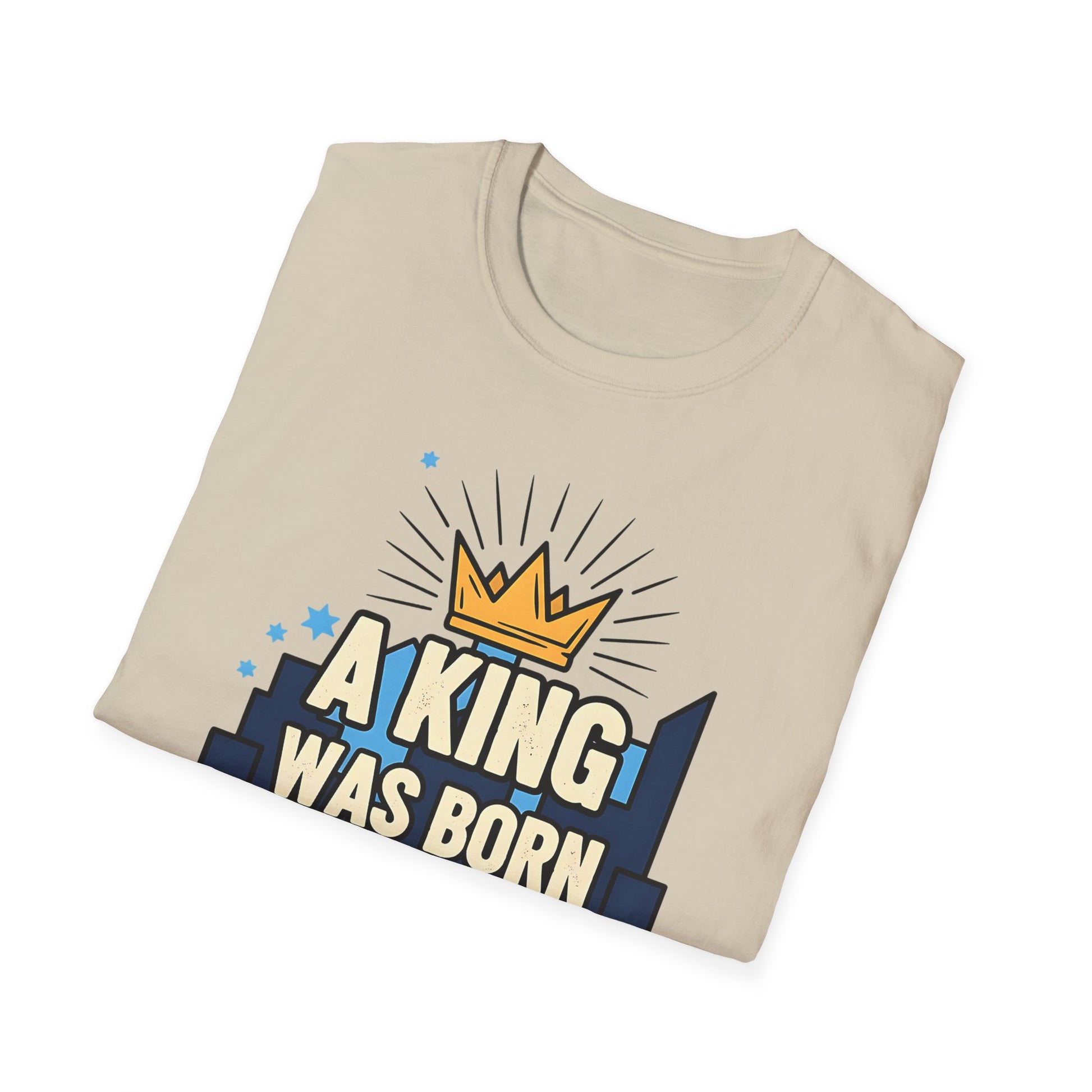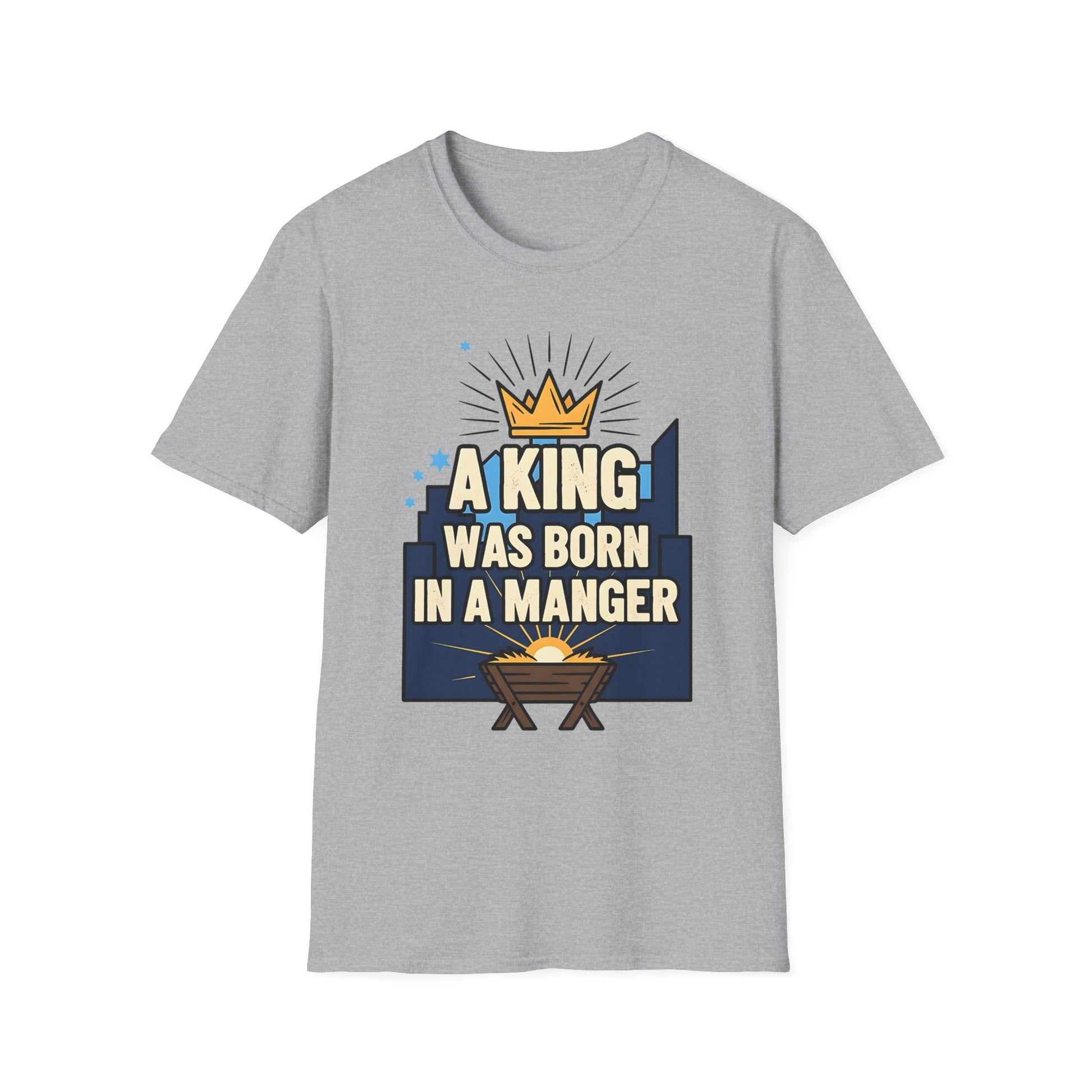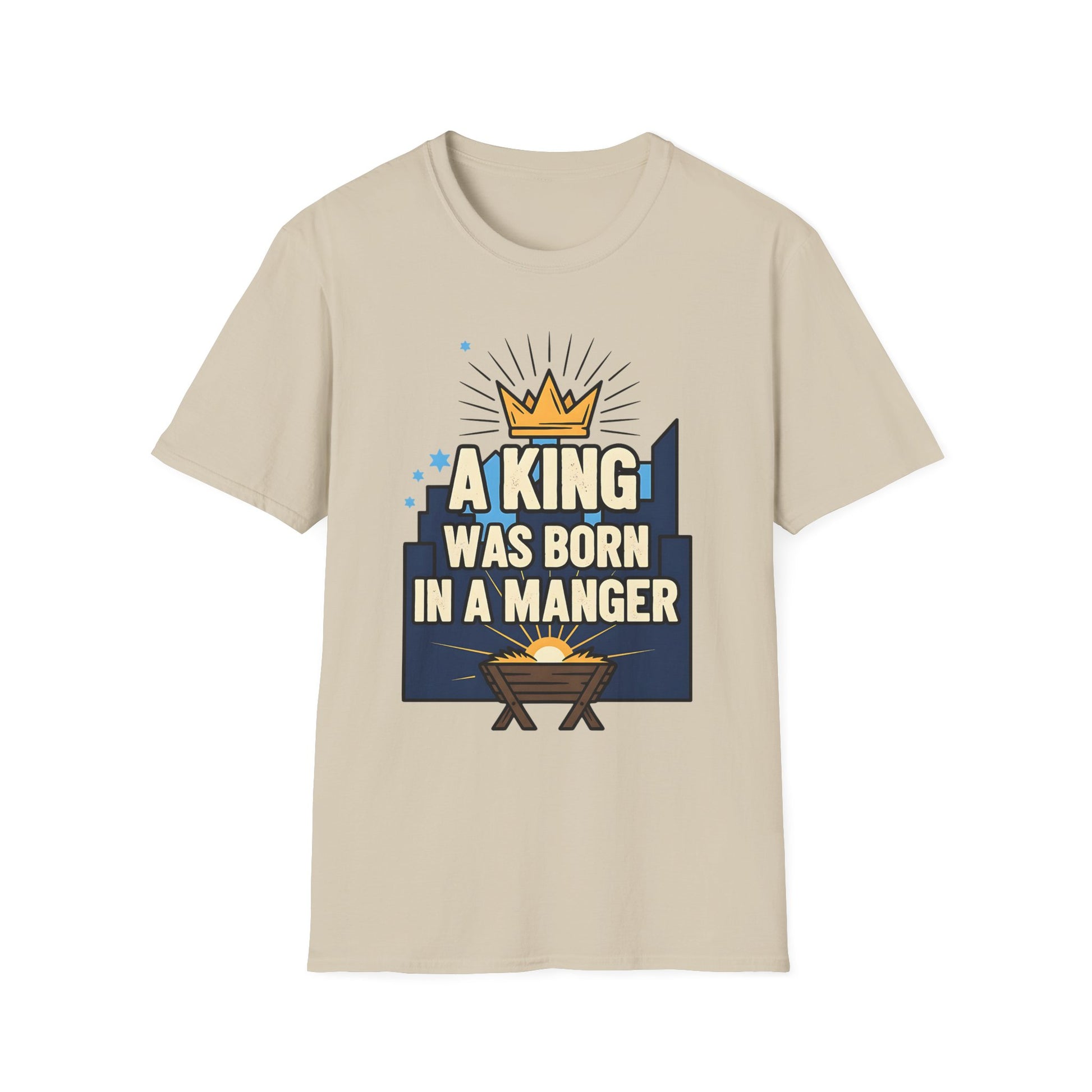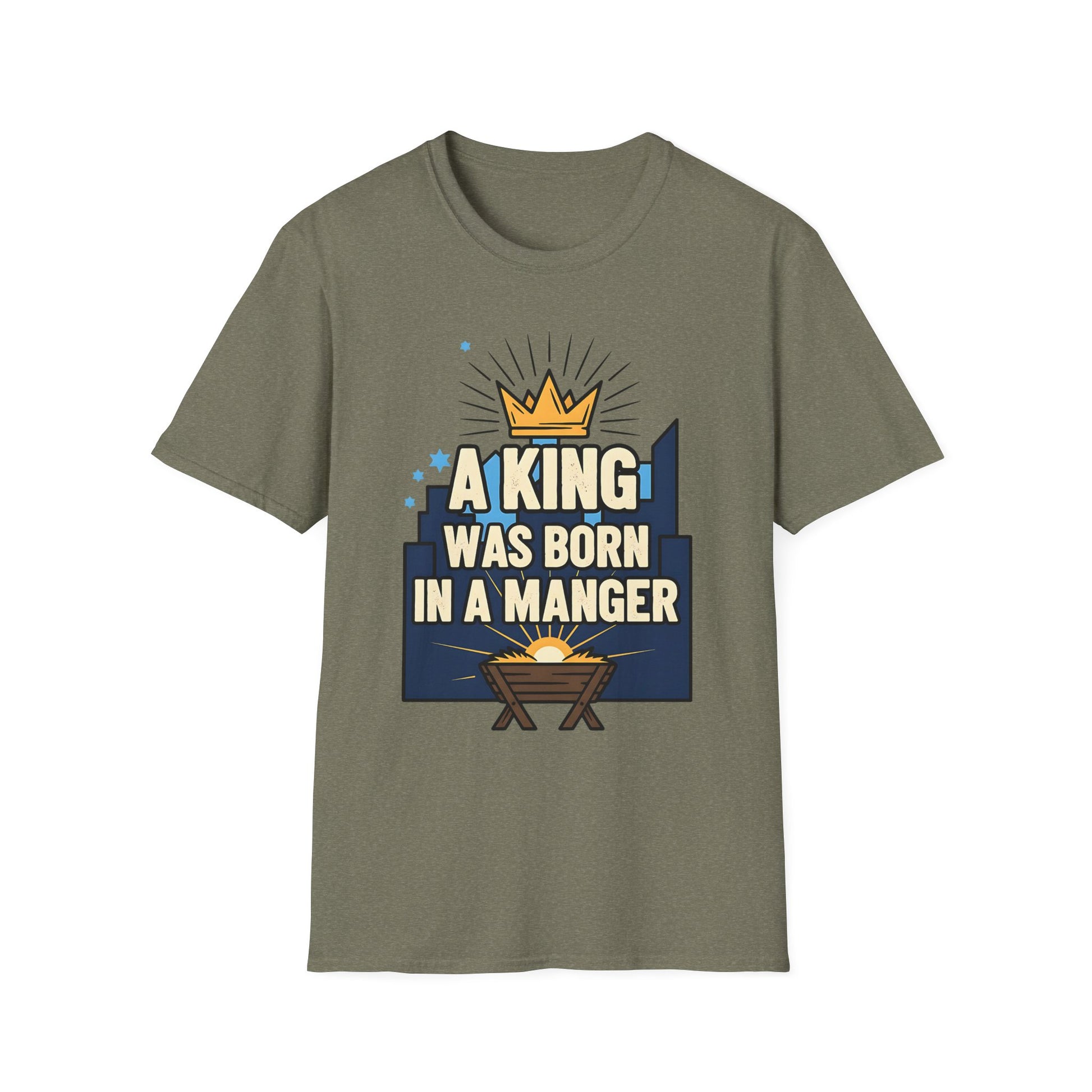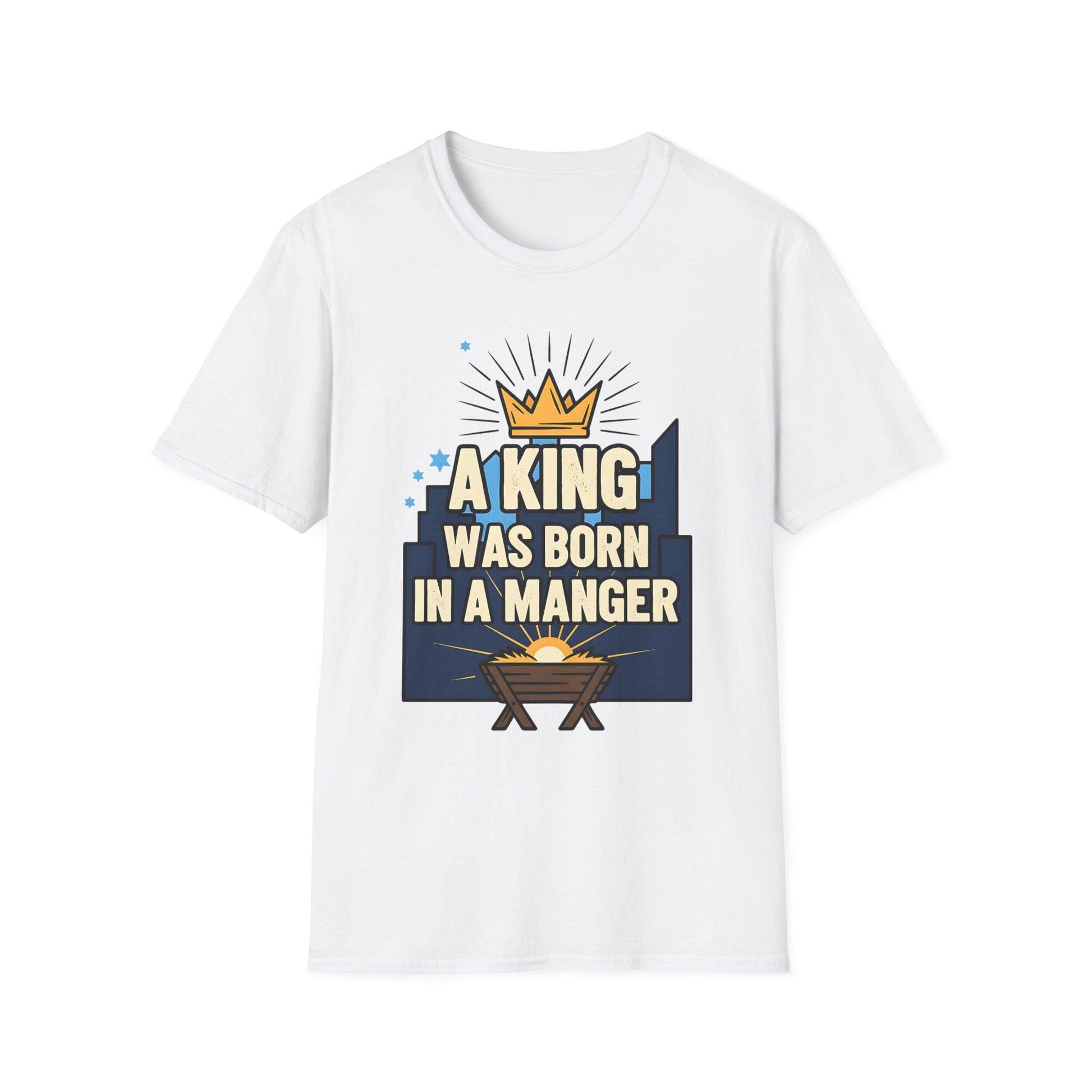 A063 - Introducing this stunning Unisex Softstyle T-Shirt, perfect for adding a touch of style and meaning to your wardrobe. Made with 100% ring-spun cotton, it offers a lightweight, breathable feel that you'll enjoy year-round. The vibrant design, featuring the message "A King Was Born In A Manger," sets a celebratory tone, ideal for the holiday season, particularly Christmas. Wear it to festive gatherings, holiday parties, or casual family get-togethers to express your joy and spirit. This shirt makes a thoughtful gift for anyone who cherishes the meaning of Christmas, and its classic fit allows it to complement various outfits for any occasion, be it formal or casual. With its comfortable material and stylish design, this T-Shirt is a great addition to any fashion-forward individual’s collection of holiday attire.