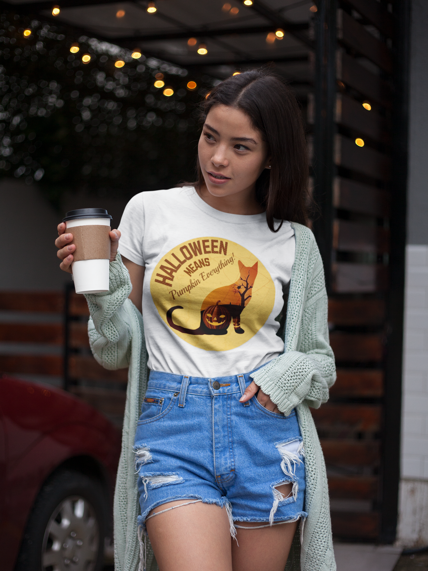 A027 - Celebrate the joy of the harvest season with this playful yet thoughtful design. Featuring autumn imagery—a glowing moon, a cat silhouette, carved pumpkins, and a barren tree—highlighting the phrase “Halloween Means Pumpkin Everything!” in a way that invites warmth, gratitude, and reflection. Made from lightweight, 100% ring-spun cotton, it feels soft against your skin and is a perfect choice for Christians who enjoy seasonal fun while keeping their values front and center.