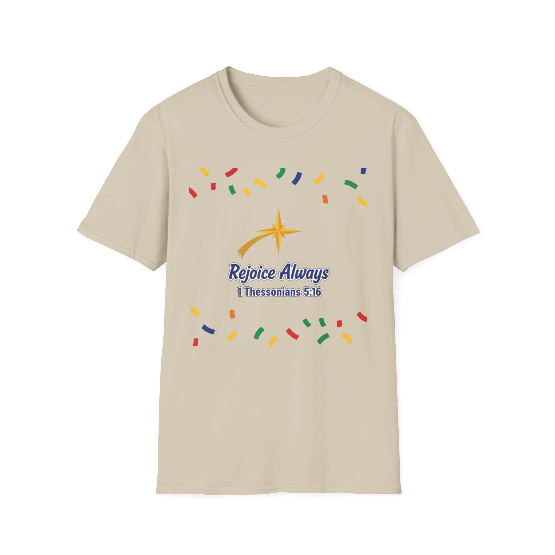 A080 - Celebrate positivity and joy with this unisex softstyle t-shirt adorned with the uplifting phrase "Rejoice Always" from 1 Thessalonians 5:16. Its design radiates a cheerful and vibrant atmosphere perfect for everyday wear or special occasions. This versatile t-shirt is designed for anyone looking to spread good vibes and share a message of hope. Ideal for casual outings, religious gatherings, or holiday celebrations, it makes a thoughtful gift for friends and family during moments of joy, such as Christmas, Easter, or birthdays. Fashion meets comfort in this stylish piece, making it a welcomed addition to any wardrobe.
