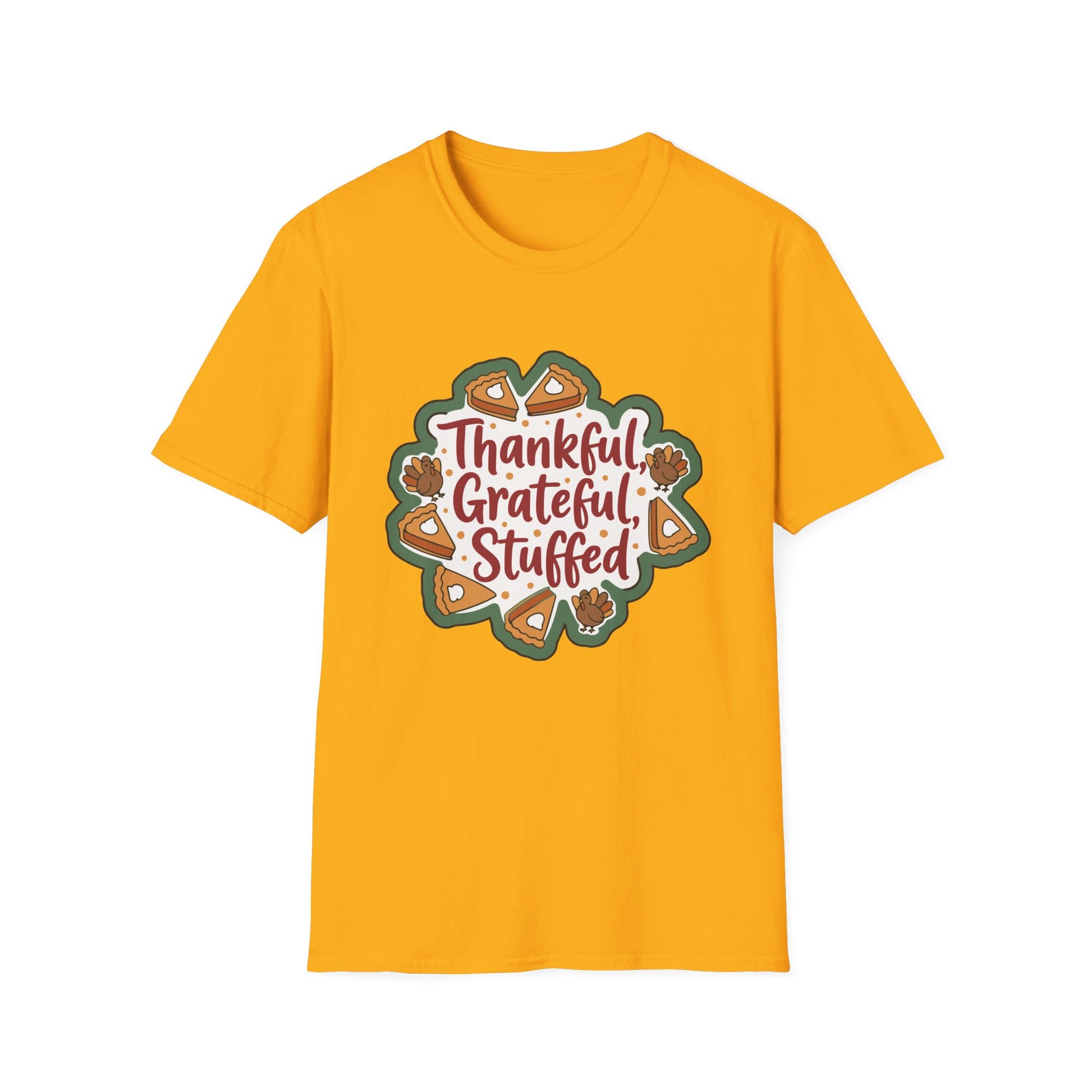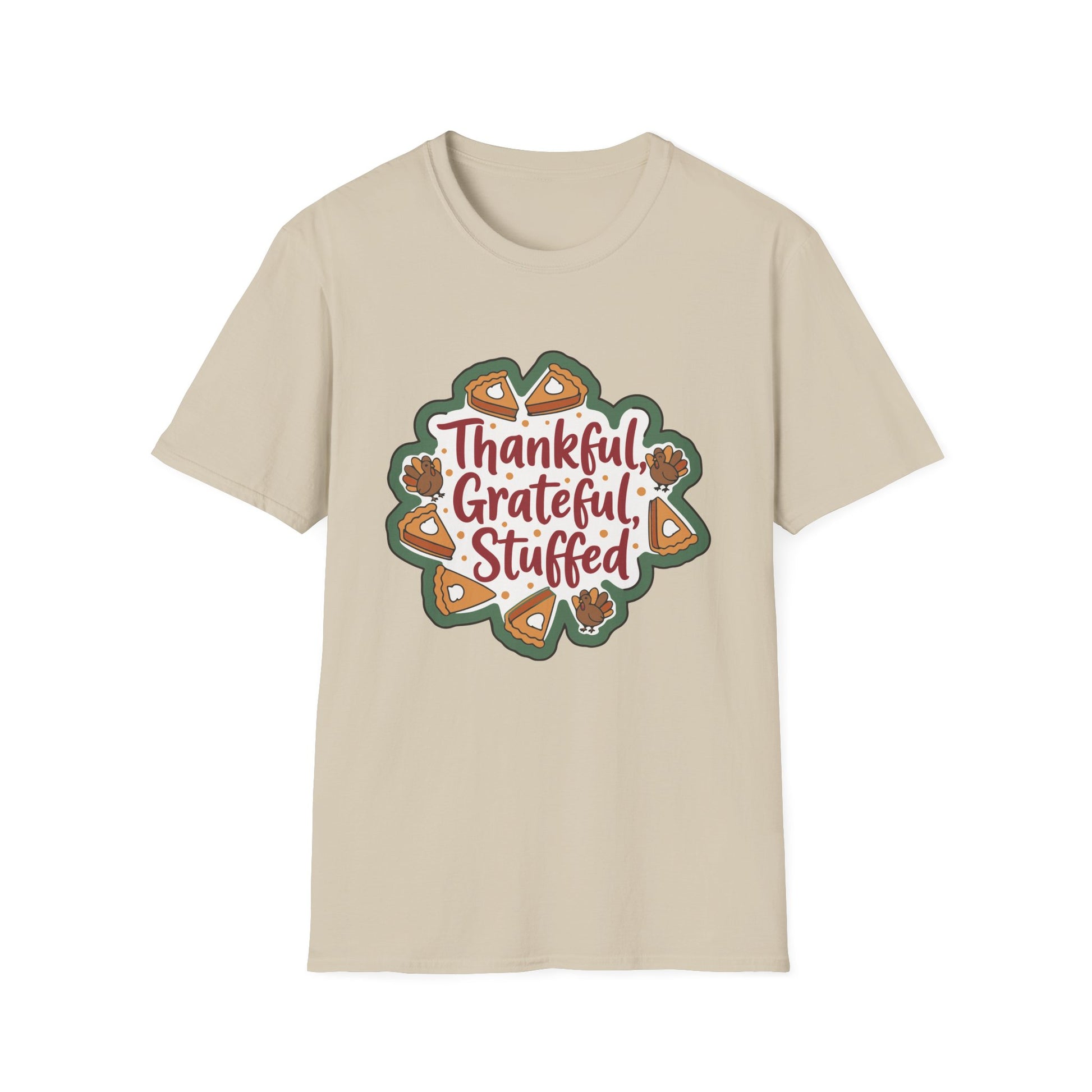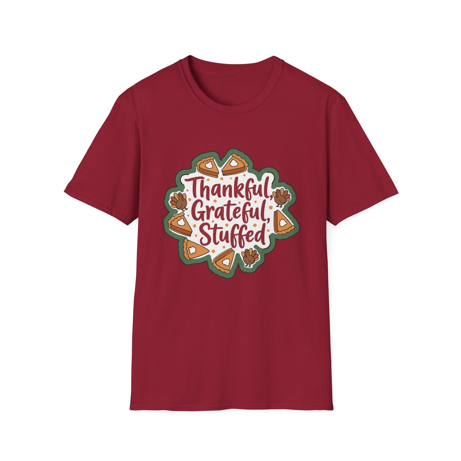 A047 - Introducing the perfect addition to your casual wardrobe: a stylish unisex softstyle t-shirt that exudes comfort and modern flair. Made from 100% ring-spun cotton, this lightweight fabric keeps you feeling blissful throughout the day, no matter the occasion. The classic fit and crew neckline offer versatility, allowing you to dress it up for semi-formal events or keep it casual for everyday wear. With its whimsical 'Thankful, Grateful, Stuffed' print, this t-shirt embodies a cozy, festive vibe that's ideal for Thanksgiving celebrations, casual gatherings, or simply lounging at home. It’s not just a t-shirt; it’s a reminder to cherish the moments and the people around you. Great for friends, family, or anyone who values comfort and style, this shirt makes an excellent gift during the holiday season, or a delightful treat for yourself!