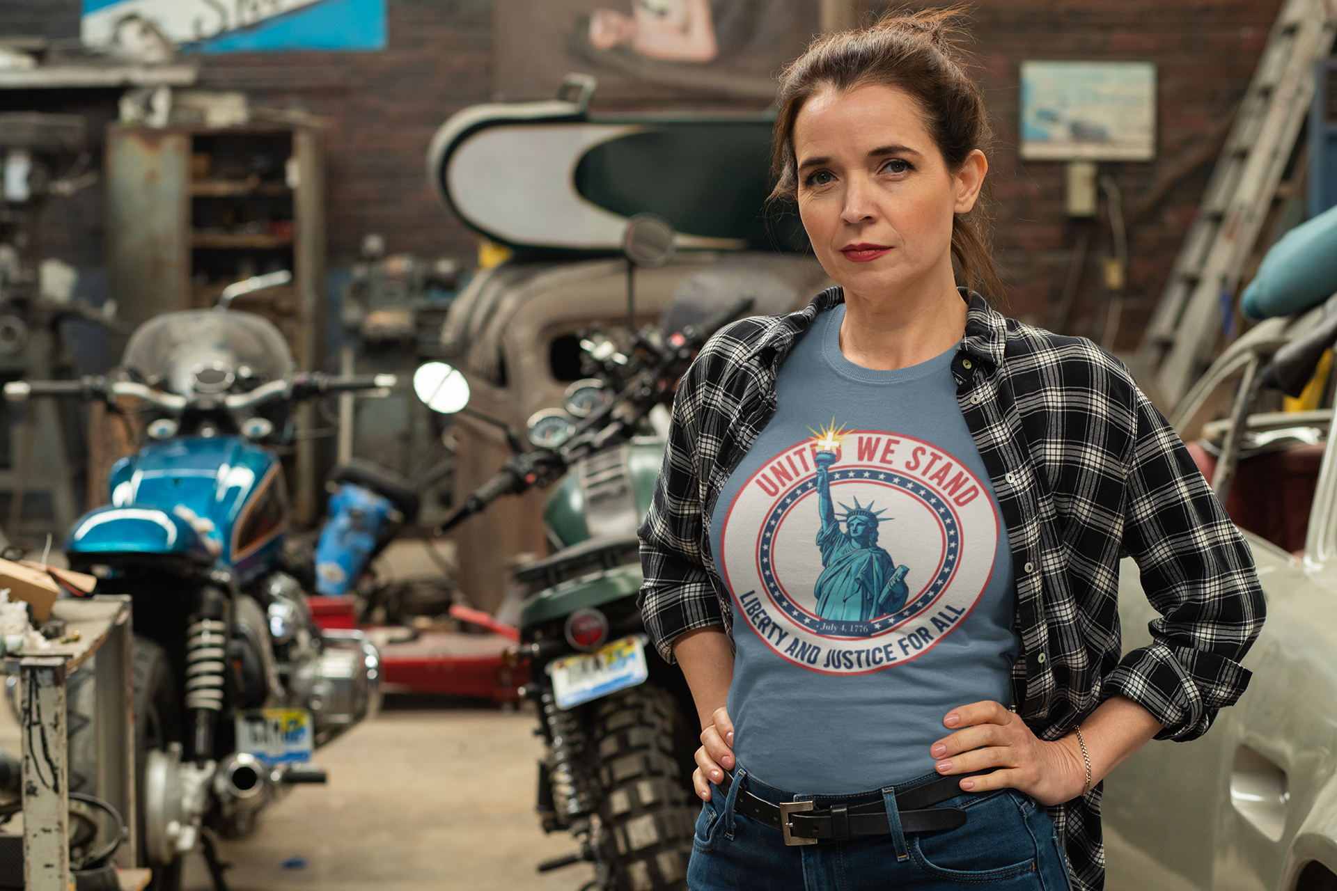 A174 - Introducing a light, breathable tee with a vintage-inspired Liberty design that wears like a favorite right away. The statue-of-liberty graphic — softened blues and muted reds inside a circular badge reading “UNITED WE STAND / LIBERTY AND JUSTICE FOR ALL” — sits centered on a classic crew unisex t-shirt. The shirt drapes cleanly thanks to the tubular knit construction and stays comfortable through seasons with soft 100% ring-spun cotton. Subtle details like a ribbed collar, shoulder tape for shape retention, and a pearlized tear-away label keep the focus on comfort. Wear it to rallies, neighborhood barbecues, or quiet mornings at the café — it carries a calm, civic pride without shouting.